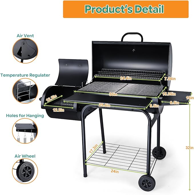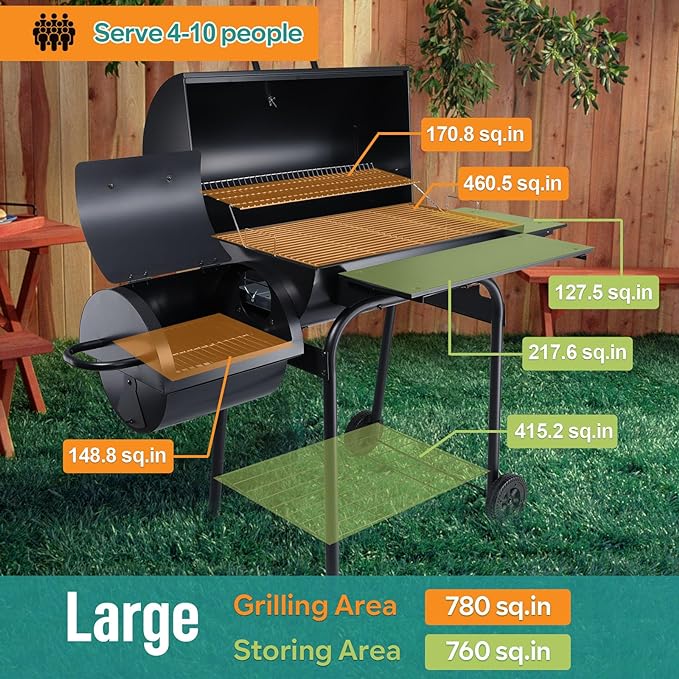 Charcoal Grill Offset Smoker, Heavy Duty Portable Barbecue Grill with 780 SQ.IN. Cooking Grilling Area, BBQ Barrel Grills with Wheels for Outdoor Patio, Side Table & Adjustable Carbon Pan